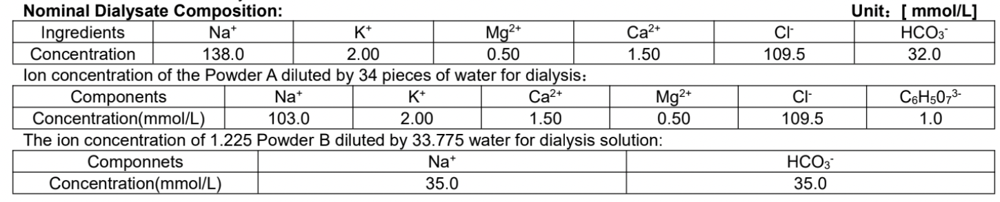 - Please refer to the operating manual of dialysis machine to confirm the concentrated dialysis model, pH value and the mixture ratio.