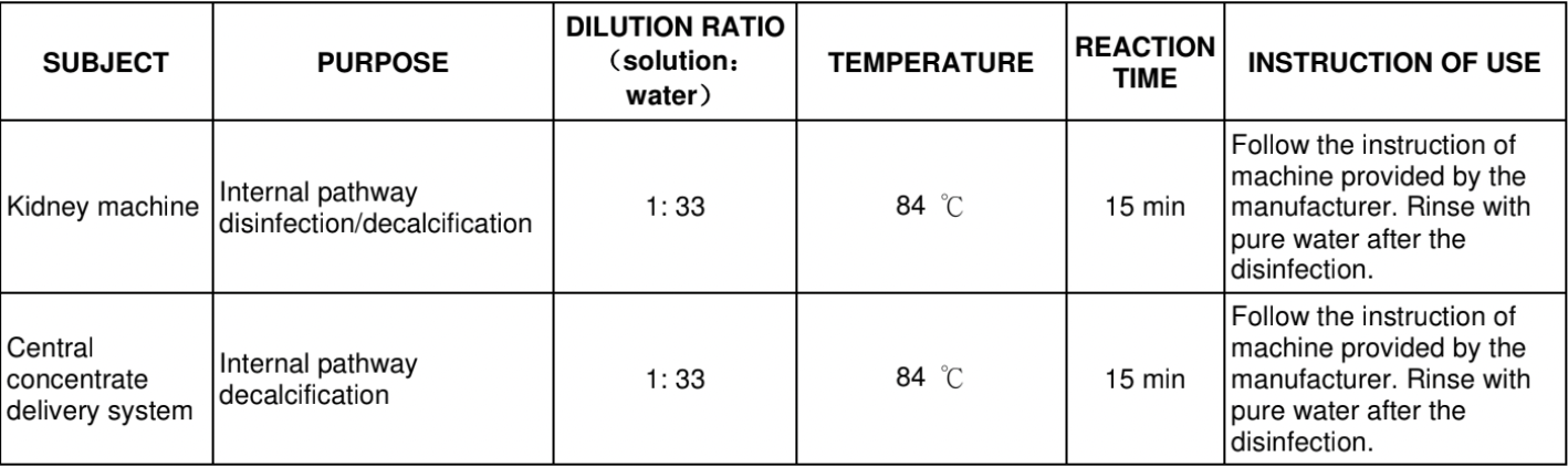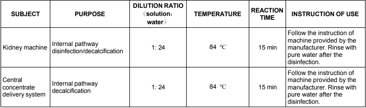 Indication: Citrocide® is indicated for the routine disinfection and decalcification of internal fluid pathways of hemodialysis machines or central concentrate delivery system. It is intended to reduce microbial contamination, including bacteria, mycobacteria, spores, and viruses, thereby maintaining the safe operation of hemodialysis systems and minimizing infection risks to patients.