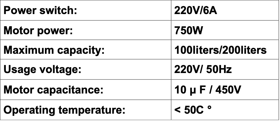 Specifications: 100L, 200L